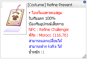 เมื่ออัพเกรดไอเท็ม ล้มเหลว Costume ของท่านจะไม่หาย หายเพียงแต่ Elunium 5 ea และ 500,000Zeny เท่านั้น